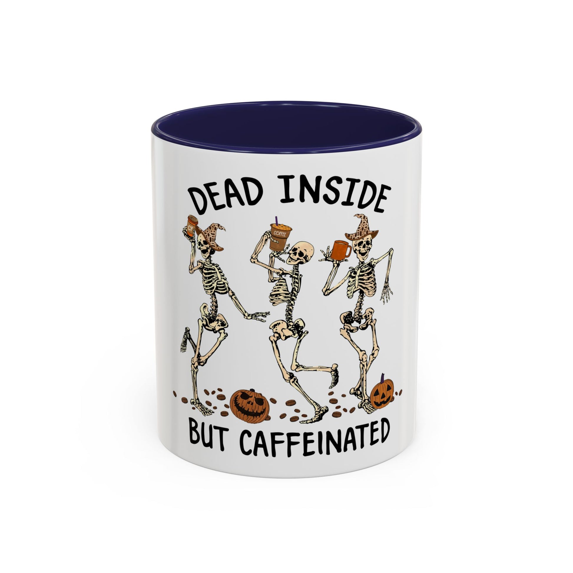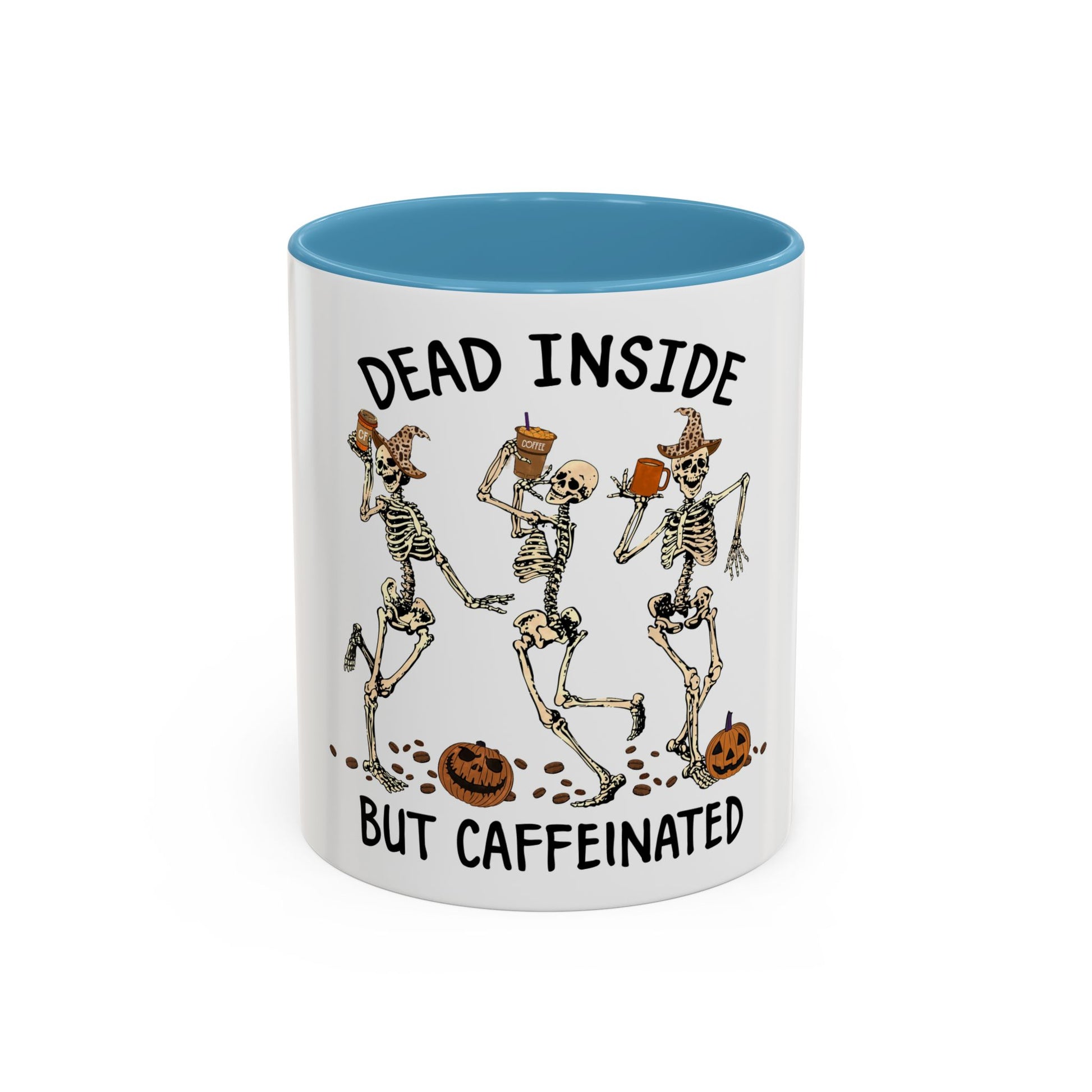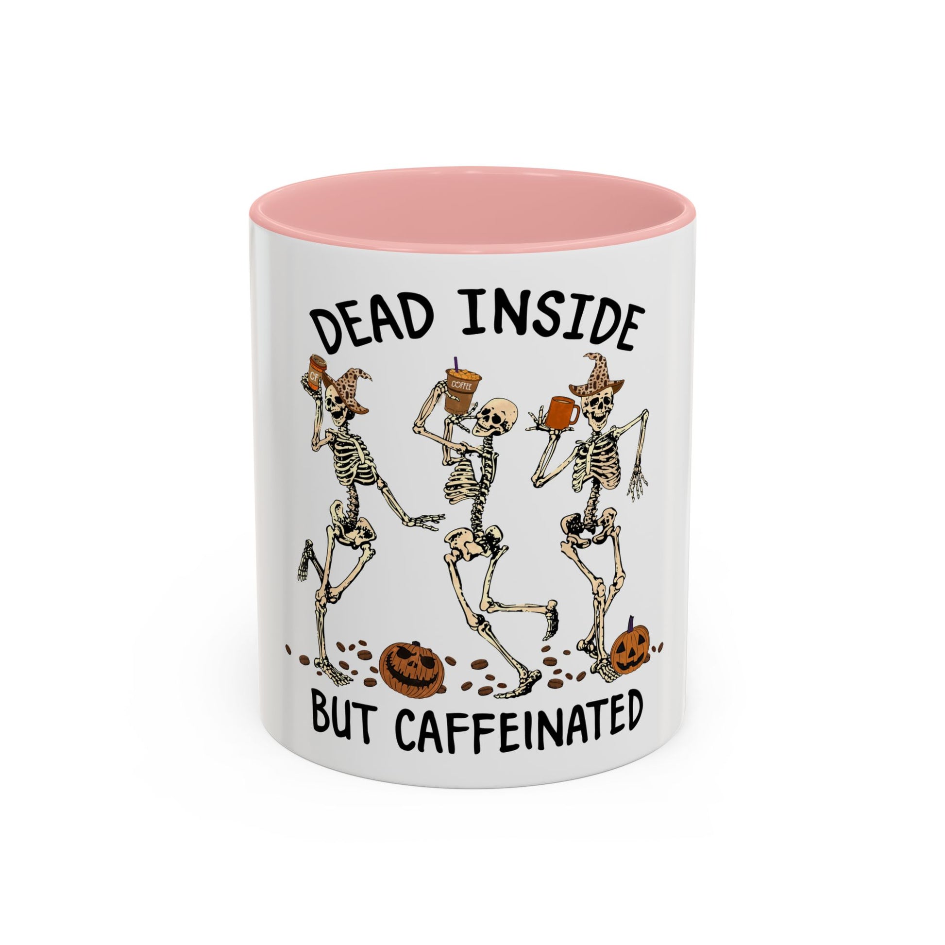 Enjoy your favorite beverages in style with this playful Accent Coffee Mug. Featuring a whimsical design of dancing skeletons with the phrase 'Dead Inside But Caffeinated,' this mug brings a lighthearted vibe to your morning routine. Perfect for coffee lovers and anyone with a quirky sense of humor, it's an ideal gift for friends, family, or even yourself during Halloween or cozy autumn gatherings. Whether you’re sipping your morning brew or enjoying an evening cup of tea, this mug adds a dash of fun to any occasion. Lightweight and easy to handle, it suits both vibrant kitchen spaces and cozy home offices, making it a versatile addition to your collection.