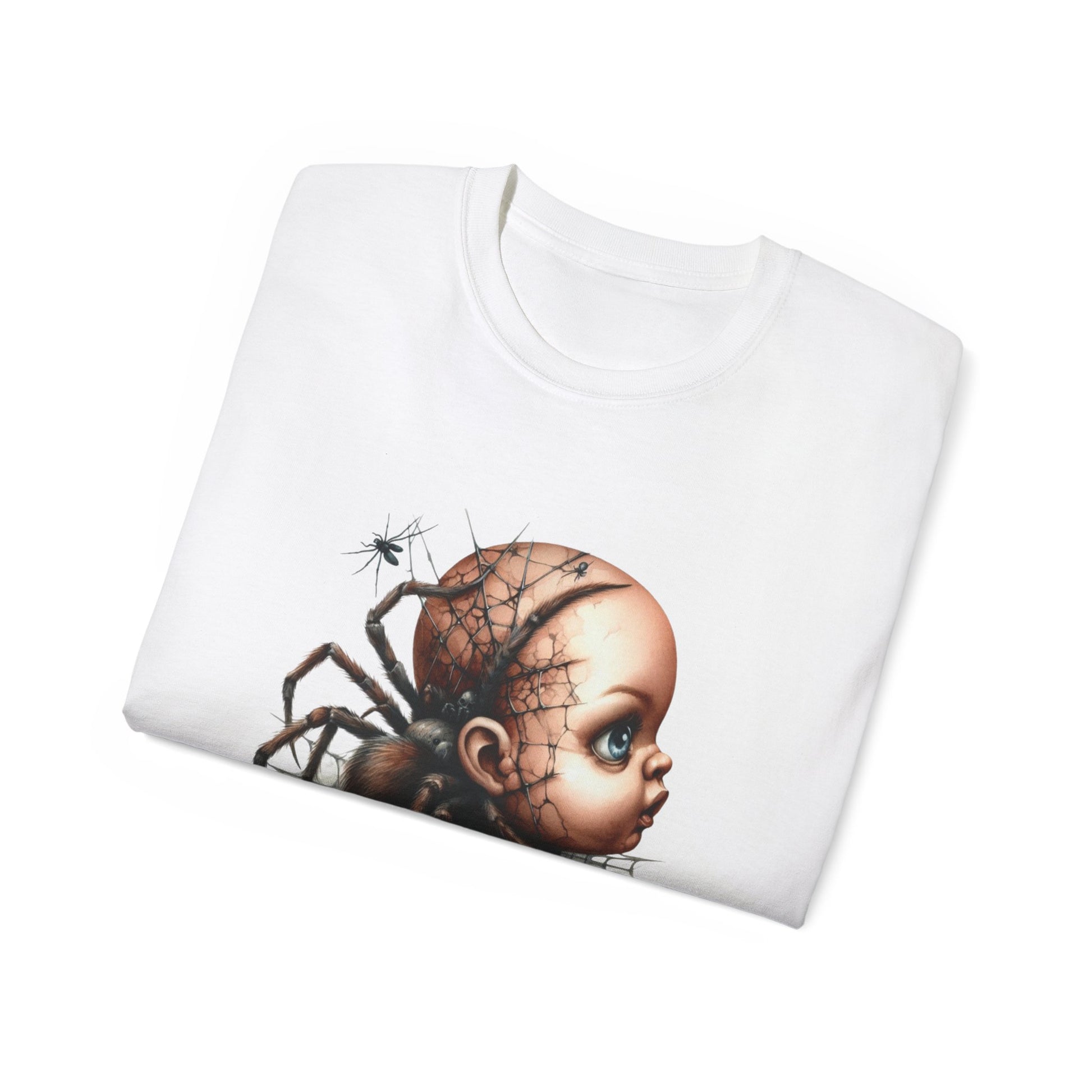 Creepy Doll Spider Tee, Unisex Horror T-Shirt, Halloween Graphic Tee, Unique Gift for Collectors, Spooky Fashion Statement