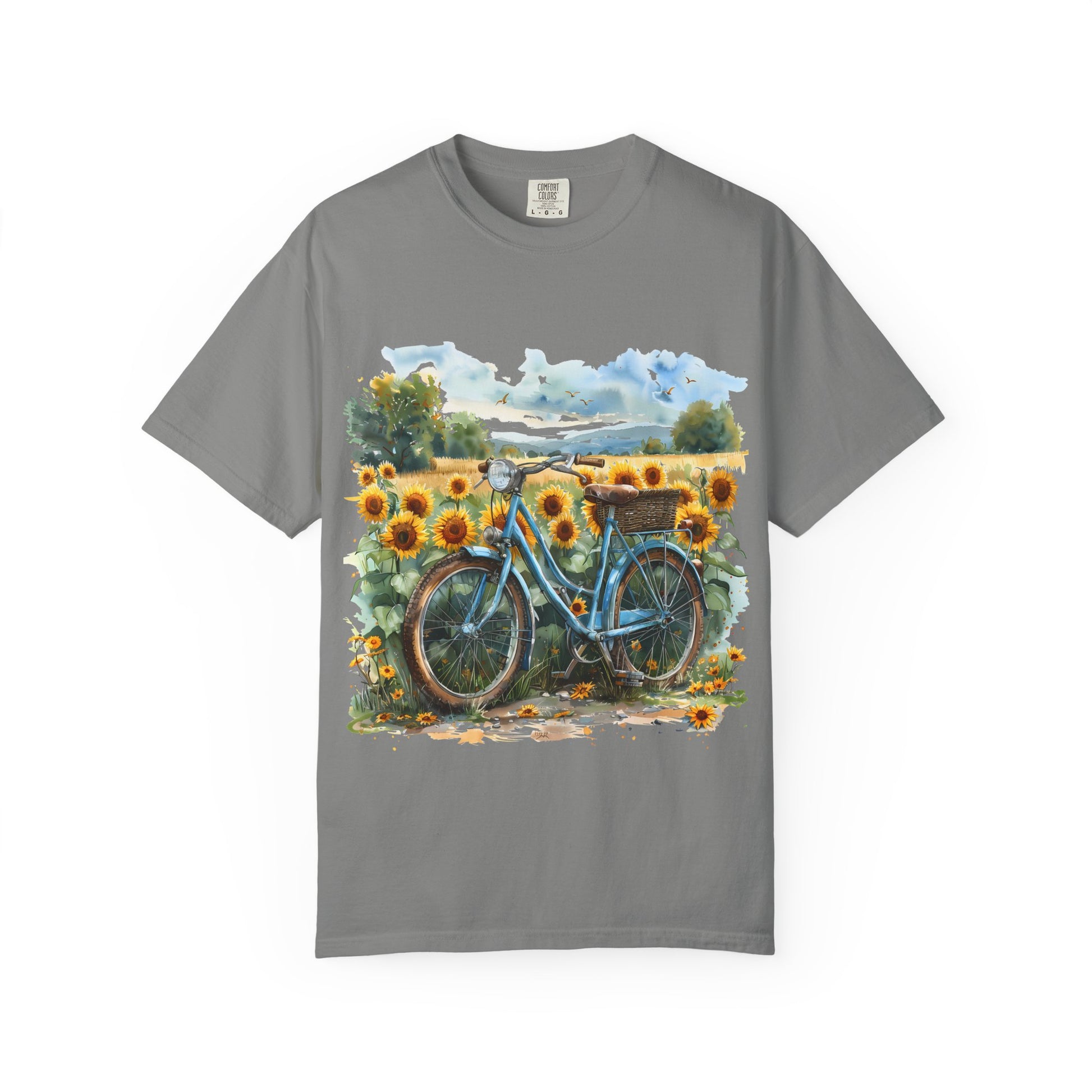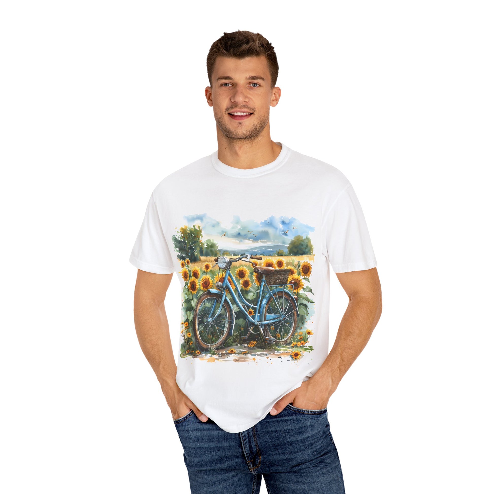 Embrace casual elegance with our Unisex Garment-Dyed T-shirt, perfect for adding a touch of artistry to your wardrobe. Featuring a vibrant design of a bicycle surrounded by sunflowers, this tee radiates a cheerful vibe, making it ideal for sunny days at the park or laid-back gatherings with friends. It's a stylish option for anyone who appreciates comfort and creativity, perfect for outdoor enthusiasts and flower lovers alike. This versatile shirt is an excellent choice for birthdays, Mother's Day, and casual summer celebrations, ensuring you stand out while enjoying a relaxed fit. Experience comfort, quality, and a splash of color in your everyday life with this exceptional piece.